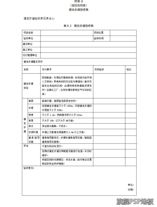 健走步道建成應(yīng)通過相關(guān)驗(yàn)收,驗(yàn)收表參照附錄B。